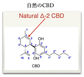 (天然のCBDでは右図の分子構造で左上のベンゼン環の二重結合の位置がΔ-2(デルタ)になりますが、異性体の場合他の位置になります。)